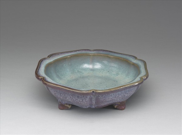 盆托作六瓣葵花形,圓口出沿,沿邊凸起細稜一道。淺壁,壁面依隨葵花形,而作拱起、凹進的變化。平底,下承三雲頭形足。胎厚釉濃,器形端整,線條分明。通體罩施天藍、葡萄紫釉,釉彩乳濁明亮,釉表氣泡稯眼明顯。器內天藍釉面出現深藍斑點與蚯蚓走泥紋,外壁由多層釉彩交融而出的淡紫、深紫色流釉與蚯蚓走泥紋,宛如抽象的圖案。稜邊皆呈褐色,施釉至底足,外底塗褐黃色護胎釉,周緣有支燒痕十七枚,底印數目字「四」,並有清宮所刻「重華宮芝蘭室用」的款記。