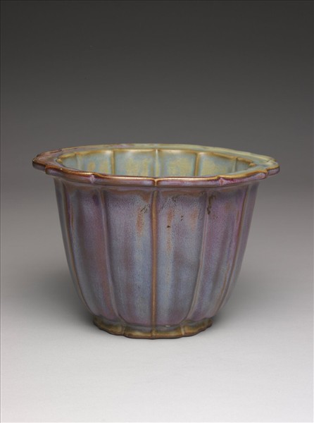 器作六瓣蓮花形,侈口寬邊,深壁,平底矮圈足。器內釉呈天藍色,間現淺粽色,外壁釉呈現葡萄紫色,釉薄處亦現棕色。器底棕色,留有五排水孔,刻有「十」字記號。