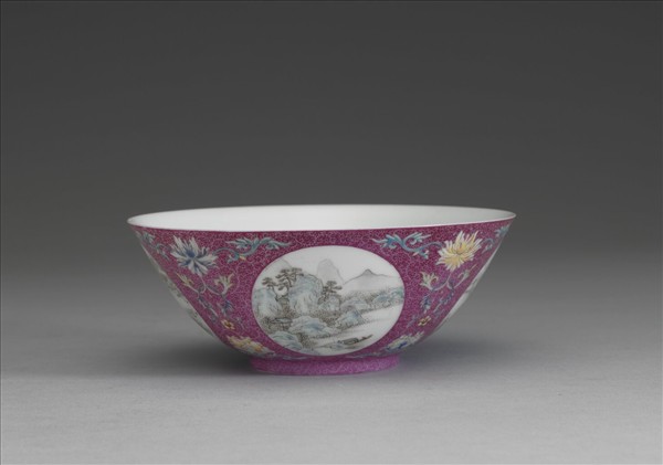 敞口,弧壁,圈足。器內白地繪有琺瑯彩描金圖案花紋,外壁紫紅地上錐剔鳳尾形卷草錦地紋,餘隙四圓形開光內,分別以墨彩及彩繪畫中國山水人物畫,或繪飾兩人相會於山林間,或有一葉扁舟浮於江中,四幅圖畫皆呈現出寧靜悠遠之氛圍,別有趣味。開光之間鉤繪圖案式洋花,周圍並點綴小朵花。器底青花書「大清乾隆年製」六字三行篆款,色澤淺淡。於錦地隙處繪飾花紋或開光之技法又稱為「錦上添花」,為乾隆朝琺瑯彩瓷常見之技法。