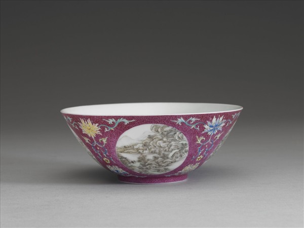 敞口,弧壁,圈足。器內白地光素無紋,外壁紫紅地上錐剔鳳尾形卷草錦地紋,餘隙四圓形開光內,分別以墨彩及彩繪畫中國山水人物畫,或繪飾兩人相會於山林間,或有一人騎驢行走於山中,四幅圖畫皆呈現出寧靜悠遠之氛圍,別有趣味。開光之間鉤繪圖案式洋花,周圍並點綴小朵花。器底青花書「大清乾隆年製」六字三行篆款,色澤淺淡。於錦地隙處繪飾花紋或開光之技法又稱為「錦上添花」,為乾隆朝琺瑯彩瓷常見之技法。