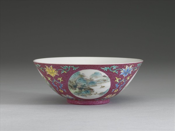 敞口,弧壁,圈足。器內白地光素無紋,外壁紫紅地上錐剔鳳尾形卷草錦地紋,餘隙四圓形開光內,分別彩繪畫中國山水人物,或繪飾一老者持杖過橋,或有數艘帆船行駛於遼闊江面,四幅圖畫皆呈現出不同趣味。開光之間鉤繪圖案式洋花,周圍並點綴小朵花。器底青花書「大清乾隆年製」六字三行篆款,色澤淺淡。於錦地隙處繪飾花紋或開光之技法又稱為「錦上添花」,為乾隆朝琺瑯彩瓷常見之技法。