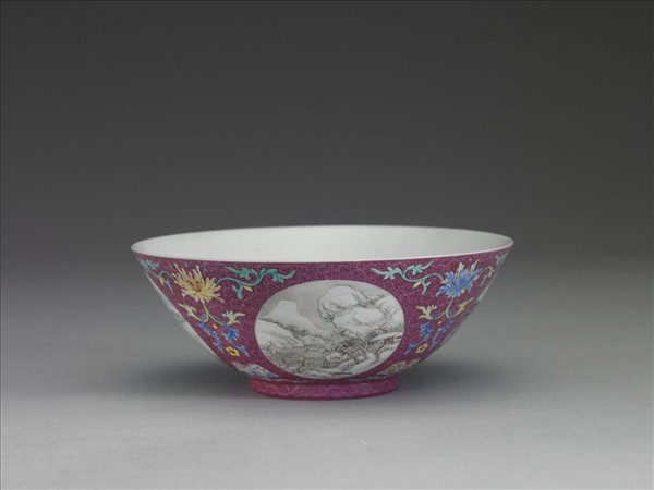 敞口,弧壁,圈足。器外壁紫紅地上錐剔鳳尾形卷草錦地紋,餘隙四圓形開光內,分別以墨彩及彩繪畫中國山水人物畫,畫中亭台樓閣亦描繪細膩。開光之間鉤繪圖案式洋花,周圍並點綴小朵花。器底青花書「大清乾隆年製」六字三行篆款。於錦地隙處繪飾花紋或開光之技法又稱為「錦上添花」,為乾隆朝琺瑯彩瓷常見之技法。
