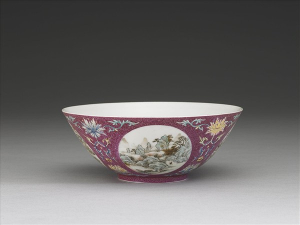 敞口,弧壁,圈足。器內底白地無紋,外壁紫紅地上錐剔鳳尾形卷草錦地紋,餘隙四圓形開光內,分別以墨彩及彩繪畫四季山水人物畫,或有一人騎驢於山林間,或有三五好友相談甚歡,四幅圖畫皆呈現出寧靜悠遠的氛圍。開光之間鉤繪圖案式洋花,周圍並點綴小朵花。器底青花書「大清乾隆年製」六字三行篆款。於錦地隙處繪飾花紋或開光之技法又稱為「錦上添花」,為乾隆朝琺瑯彩瓷常見之技法。
