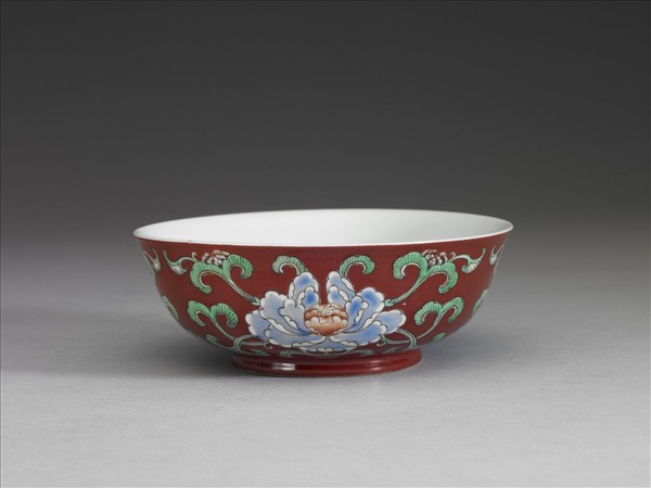 洋彩紅地花卉紋碗