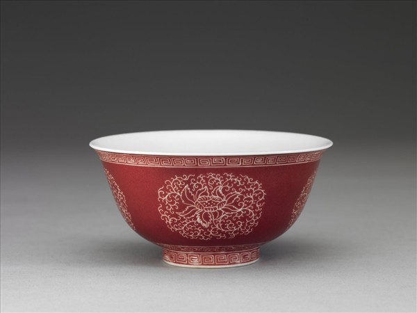 撇口,弧壁,矮圈足。外壁以琺瑯紅彩為地,其餘紋飾均以錐剔技法雕花,口、足各回紋及留白一周,碗壁團花四朵,底邊卷草紋一周,內壁白釉上琺瑯彩繪月季花及藍雛菊各一株。白釉瑩潔,胎薄透光,雕工精緻。器底藍料書「乾隆年製」四字二行仿宋體楷款,外加雙方框。此器在《琺瑯、玻璃、宜興、磁胎陳設檔案》內所載名為「瓷胎畫琺瑯白番團花紅地茶鍾 壹對」,與本院所藏的二件相同。