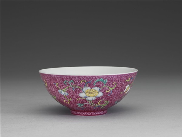 敞口,弧壁,矮圈足。內底為白地,繪兩折枝桃實、一佛手與兩石榴,其中一顆石榴露出內部飽滿的種籽。外壁紫紅地上錐剔卷草紋,口沿處留白一周,隙地加飾彩繪折枝花四朵,枝葉捲曲盤繞於四周,花朵朝向正前方,其左側皆連接另一朵小花,只可見到其側面。器底為白地,以青花書「大清乾隆年製」六字三行篆款,青花色澤淺淡。於錦地隙處繪飾花紋之技法又稱為「錦上添花」,為乾隆朝琺瑯彩瓷常見之技法。