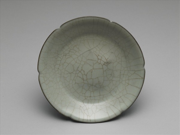 此碟口作六瓣葵花形,腰平折為底,帶圈足。全器施以灰白釉,部份區域色近米黃,口沿和足緣釉層淺,色近灰紫。釉層乳濁不透,光亮瑩潤,並有褐色開片,外底有五個支釘痕,露出褐黑色胎土。