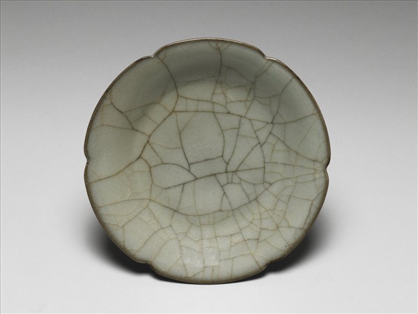 此碟口沿外撇,且有六個凸出,造型彷若葵花,腰平折為底,帶圈足。全器施以灰青釉,釉質乳濁厚重,但帶有瑩潤的光澤,唯口沿和足緣因釉層較淺,略呈褐色。釉面滿佈開片,多為黃褐色,僅分佈於內壁正中的裂紋呈黑色。外底部另有五個支釘痕,露出灰色胎土。