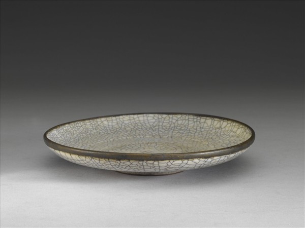 此碟口緣微歛,圈足頗高,碟心表面有一圈壓痕。全器施粉青釉,表面有黃、黑兩色開片,細密交織如網。又,口緣鑲有銅釦,足底露出胎土。