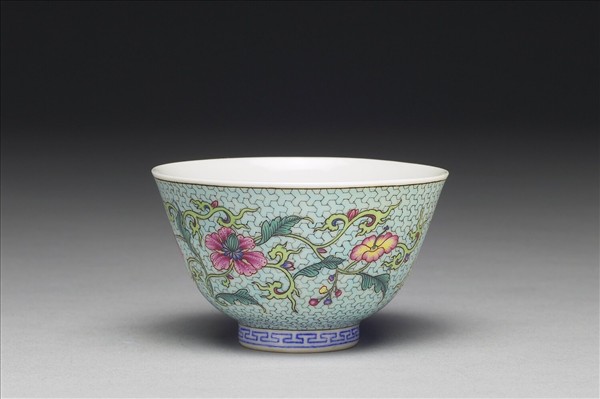 敞口,深腹,圈足。外壁各為淺綠地描黑錦花紋,餘隙彩繪轉枝洋花,器內白釉底心各繪折枝月季花一朵,口足留白一道。胎薄透光,器底藍料書「乾隆年製」二行四字仿宋楷款。