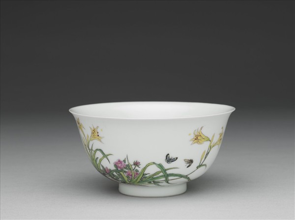 碗,侈口窄唇、深弧壁、矮圈足。胎質薄,全器以白釉為地,上繪琺瑯彩。器內壁樸素無紋,外壁見月季、萱花生長於湖石間,彩蝶繞花翩翩飛舞;一側空白處墨書題句:「曉藂色湛仙人露,畫檻香傳少女風。」疑改自初唐詩人李嶠所作五言律詩〈萱〉中「色湛仙人露,香傳少女風。」二句;詩文首尾分別有紅料所描繪之「佳麗」、「金成」、「旭映」三印,既為吉語,又與紋飾相呼應。外底中央以藍料書「乾隆年製」四字二行仿宋體款,外加粗細雙方框。