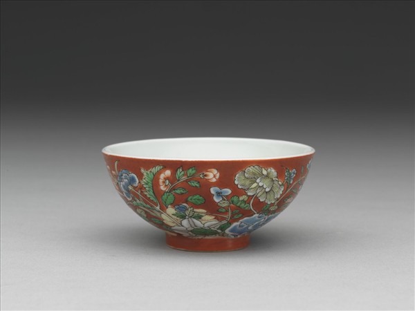杯,敞口、深弧壁、矮圈足。胎質稍厚,器內壁樸素無紋,外壁以深紅釉為地,其間彩繪牡丹、秋菊等四季花卉。外底純白,中央以藍料書「雍正御製」四字二行仿宋體款,外加雙方框