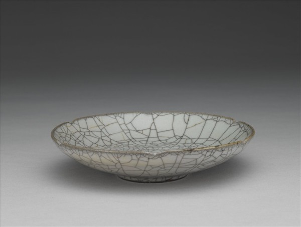 六瓣葵花口,淺弧形壁,矮圈足,挖足過肩。全器施青瓷釉,釉表開深色紋片,施釉至足邊。底緣無釉,加塗深褐色護胎汁。底面刻一「己」字銘。相對於乾隆皇帝將出現在清宮舊藏瓷器底部之「甲、乙、丙」字,看成是等第的標記。此件作品之「己」字,似乎又透露出另一種可能性。總之,前人典藏標記的存在,明顯地反映出十八世紀清宮所藏文物,確有一部份經由市場流通管道而進入清宮。