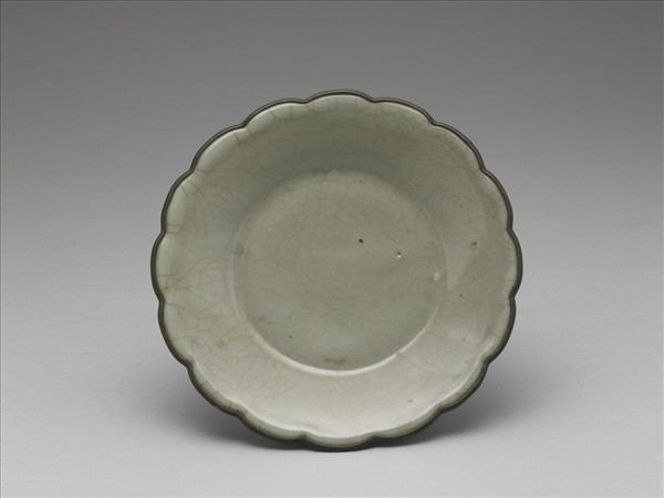 花口盤,分作十六瓣,淺斜壁,近底處出現一周窄折邊,矮圈足。採支、墊結合方式裝燒,內外施青釉,顏色青中帶灰,口沿鑲銅邊,口下有積釉痕,釉面帶淺棕色紋片,圈足修飾勻整,足端削平,塗赭汁。底周排佈六枚支燒點,支痕中顯露出鐵灰色的胎體。中心有釉下「寶用」兩字篆體銘記。由於此件展品圈足上緣出現一道窄折邊及燒製工藝特徵均與院藏另一件青瓷葵口碟(故瓷008618)相近,在該件作品可對比南京市汪興祖墓出土品,定年為元朝之下,本件展品遂應比照視為元朝製品。另一方面,浙江省杭州市老虎洞元代層窯址出土底部書寫「官窯」兩字銘的碗形器殘件標本,除了追記宋朝官窯品牌之外,也能和此件展品相呼應,反映出同樣以鐵汁書銘手法流行的情形。「寶用」銘因具備青銅器「子孫永寶用」的意涵,毋庸置疑可視為是仿青銅器作風下的產物。