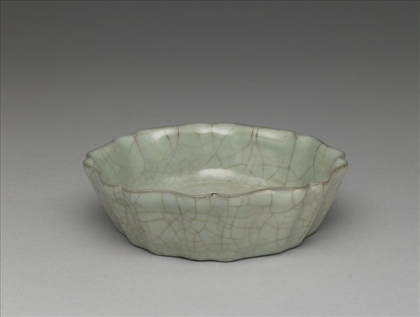 八瓣葵花形,侈口,淺壁,底略凹,無足。通體滿施青瓷釉,釉色灰青,底周有六枚圓點狀支痕,釉表開細密紋片,口沿、底緣釉薄處現出灰色邊。底面鐫刻乾隆皇帝〈詠官窯碟子〉:「掙釘猶是宋窯遺,冰裂紋存泑水滋。一例鳳凰山下土,不經陶鍊孰珍之」御製詩。詩末署「乾隆乙未春御題」紀年銘(乾隆四十年,1775),並落「太璞」一枚鈐印。近年來,由於浙江杭州老虎洞窯址的發掘中,發現模印有八思巴文以及帶「至正」紀年銘的支燒具,故讓發掘者不僅將該一地層視為是元代層,同時也將與之共伴出土瓷器的產燒時間定為元代。在此之下,傳世與該一地層所出相似的作品,遂有產燒於元代之說,此器形即是其中一例。然而,若考慮到此類製品,其實也存在部分相似於南宋官窯的特徵,以及目前也尚未能完全釐清元代產燒南宋官窯類型作品的背景下,本文仍將此類作品的產燒時間定在南宋至元之間。