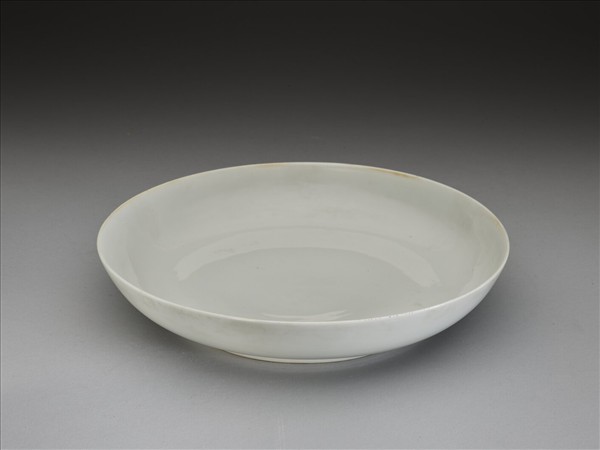 敞口,淺壁,矮圈足。釉色甜白,樸素無紋飾。底有青花書「大明弘治年製」二行六字楷款,外加雙圈。