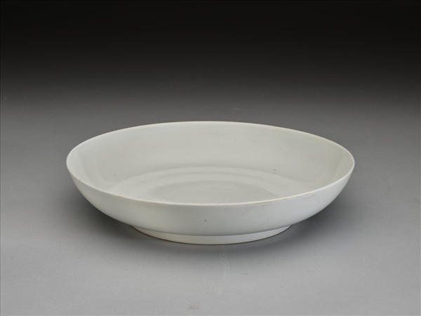 敞口,淺壁,矮圈足。釉色甜白,樸素無紋飾。底有青花書「大明弘治年製」二行六字楷款,外加雙圈。