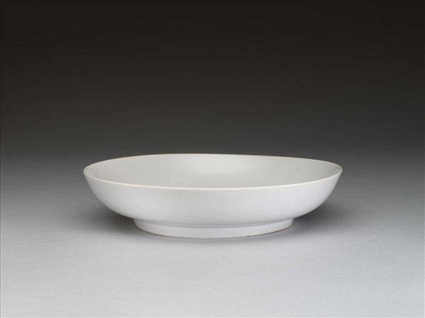 敞口,淺壁,矮圈足。釉色甜白,樸素無紋飾。底有青花書「大明弘治年製」二行六字楷款,外加雙圈。