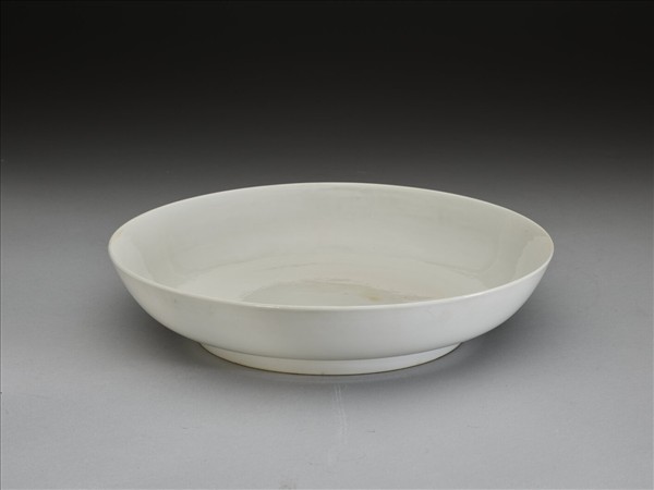 敞口,淺壁,矮圈足。釉色甜白,樸素無紋飾。底有青花書「大明弘治年製」二行六字楷款,外加雙圈。