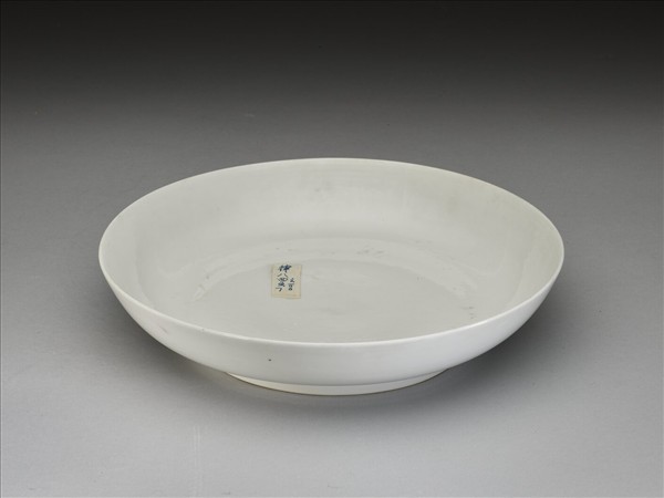 敞口,淺壁,矮圈足。釉色甜白,樸素無紋飾。底有青花書「大明弘治年製」二行六字楷款,外加雙圈。