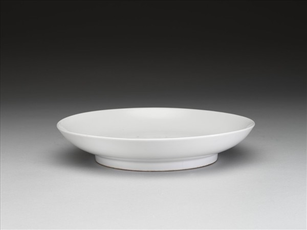 敞口,淺壁,矮圈足。釉色甜白,樸素無紋飾。