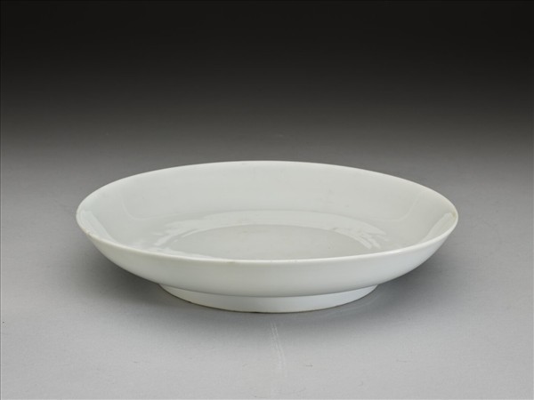敞口,淺壁,矮圈足。釉色甜白,樸素無紋飾。