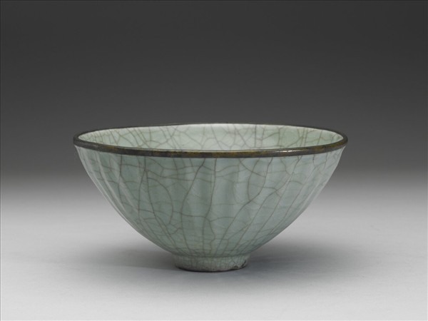 侈口,口沿嵌銅釦,弧形深壁,矮圈足。外周壁模印三十三枚狹長蓮瓣紋,瓣脊凸起。採墊燒法燒製,內外施青釉,呈色青綠,微帶粉色光澤,釉面滿佈灰棕色開片,間雜少許透明冰裂紋。施釉至足際,足端無釉露出鐵灰色胎,因釉質和胎體皆與浙江省杭州市老虎洞窯的出土品相似,故將之視為是同類的產品。
