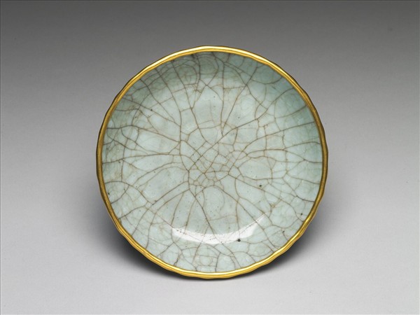 模製成形,圓口,口沿鑲鍍金銅邊,淺壁,矮圈足。外壁模飾菊瓣三十五稜,滿釉支燒,通體滿施粉青色釉,釉質清亮濃稠。釉表滿佈棕色紋片,局部可見冰裂紋。底周排佈七枚支釘,支痕中露出深灰色器胎。