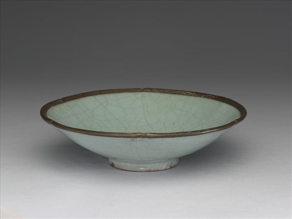花口分六瓣,侈口嵌銅釦,弧形深壁,器外微現六道淺槽,內底心凹陷一圓槽,圜底,淺圈足,足徑較大。墊燒,內外施青釉,釉層濃潤,顏色翠綠,足壁有多層施釉痕,釉表帶棕色紋片,間雜少許冰裂紋。圈足施釉不勻整,著地處露出灰色胎。