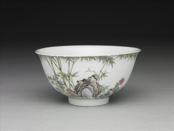 撇口碗,窄唇,深弧壁,矮圈足。薄胎白釉。器內純白無紋;器外壁一面彩畫脩竹數竿,加飾褐色湖石、月季,一面墨彩題句:「勁節亭亭千尺綠,芳枝長占四時春。」首尾各以紅料描繪「鳳采」與「淡然」、「君子」三印。外底心書「雍正年製」雙行雙方框藍料楷書款。