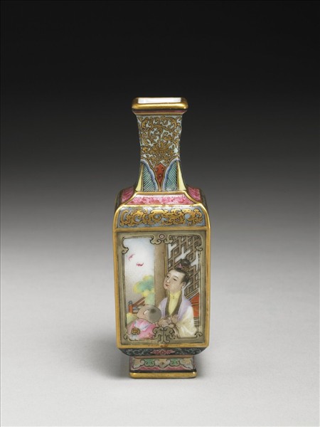 四方瓶,侈口,長頸,頸中段微歛,斜肩,長直腹,矮圈足外侈。胎質較厚,頸上畫描金番蓮,底邊畫蕉葉紋一週;胸畫描金蟠夔;腹部四面開光,二面彩畫課子圖,二面畫紅彩山水;足上畫如意雲紋。口沿、足邊及邊稜均加描金線。外底書「乾隆年製」雙行藍料楷書款。
