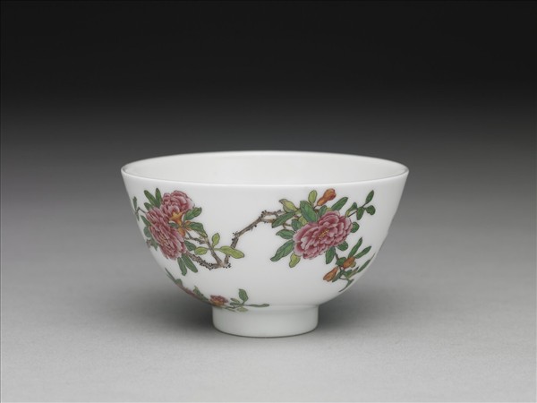 侈口杯,深弧壁,矮圈足。薄胎白釉。內壁無紋;外壁一面彩畫紅石榴一株,上棲黃鸝鳥一對,一面有墨彩題句:「新枝含淺綠,曉萼散輕紅。」首尾各以紅料描繪「佳麗」與「金成」、「旭映」三印。外底心書「雍正年製」雙行雙方框藍料楷書款。