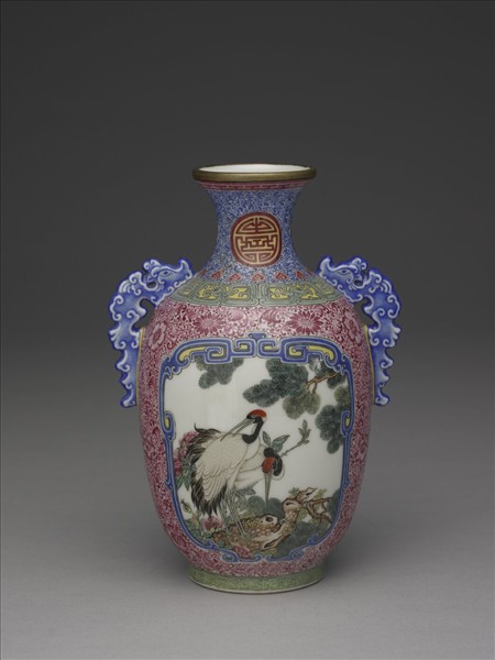 琺瑯彩開光花鳥圖螭耳瓶