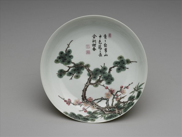 盤,侈口窄唇,淺弧壁,圈足矮寬。薄胎骨,器內施白釉,器外鵝黃色釉。內壁彩畫松、竹、梅三友圖,圖上有墨書題句:「青青自帶山中色,藹藹長含洞裡春。」首尾各以紅料描繪「鳳采」與「壽古」、「香清」三印。外壁無紋飾。底外心書「大清雍正年製」雙行雙圈青花楷書款。