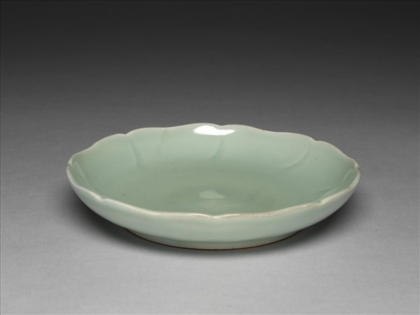 八瓣牡丹花形口,淺壁弧形,矮圈足。厚胎骨,通體施淺粉青釉,樸素無紋飾。