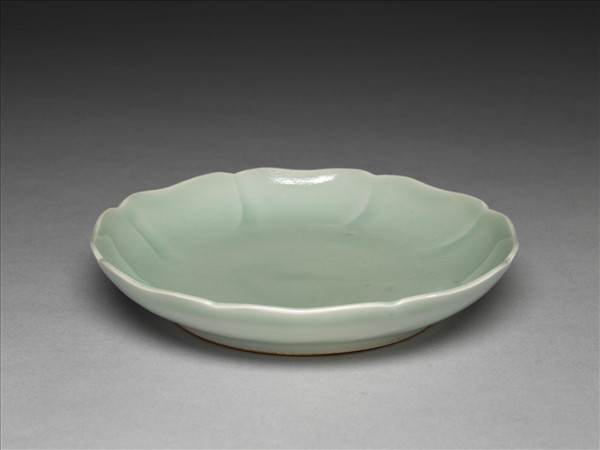 八瓣牡丹花形口,淺壁弧形,矮圈足。厚胎骨,通體施淺粉青釉,樸素無紋飾。