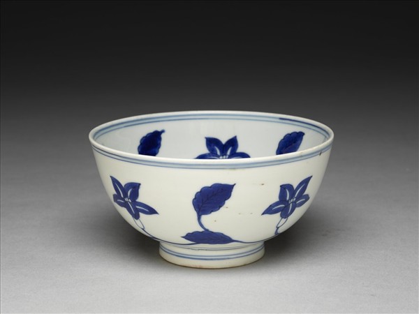 敞口,深壁,矮圈足。薄胎白釉,內外壁各畫青花轉枝花卉四朵,碗心畫菊瓣紋圖案一枚,內外口足間分飾青線十道。底有青花書「大明萬曆年製」二行六字楷款,外加雙圈。