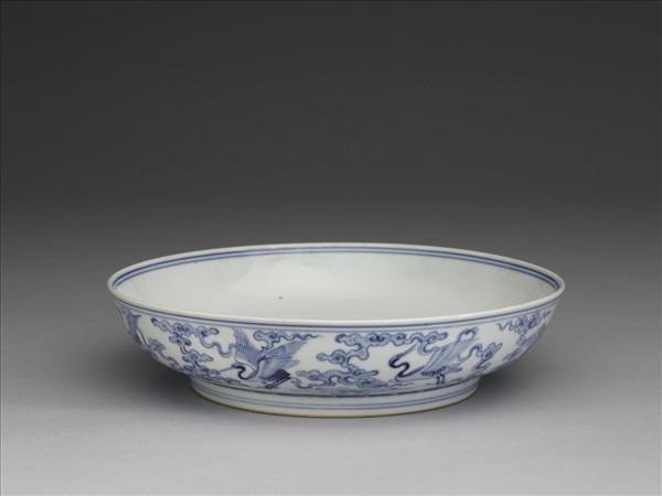 斂口,淺壁弧形,矮圈足。薄胎白釉,外面畫青雲鶴八隻,底邊飾波濤紋一周。盤心畫桃樹一株,結實九枚,加飾湖石、靈芝。周壁純白無紋飾。內外加飾青線八道。底均有青花書「大清雍正年製」六楷字款,外加雙圈。