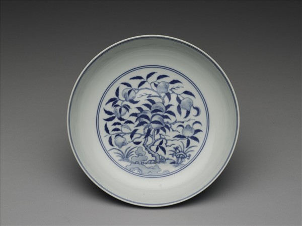 盤心畫壽桃一株,間飾湖石、靈芝、小草及青線四道。外壁繪雲鶴八隻,加飾海水、石頭,上下共畫青線四道。底青花楷書「大清雍正年製」款,外加雙圓圈。