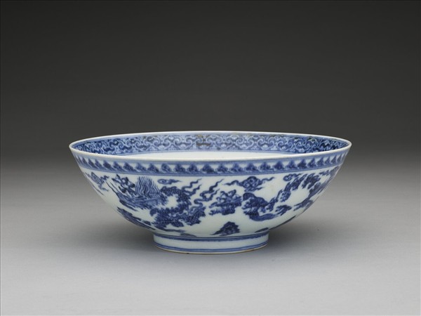 侈口,深壁弧形,矮圈足。薄胎白釉。碗內口沿下畫如意紋一道,周壁畫團龍六枚,碗心畫蓮瓣圖案。外口沿下畫雲紋一道,周壁畫雙雲龍,隙地淺劃波濤紋。花紋間加飾青線十三道。碗底畫蟠龍一條,加飾青圈。