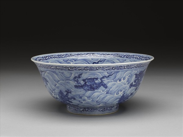 侈口窄唇,深壁,矮圈足。薄胎白釉,內壁及碗心畫深青海獸共六隻,外壁九隻,隙地間滿畫波濤紋。口沿內外及足各畫勾雲紋一周。內外花紋間加飾青線。