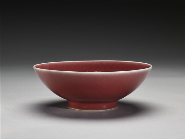 侈口,深弧壁,矮圈足。胎質稍厚,內外滿施深紅釉,碗底純白,口沿留有一道白邊,圈足底緣露胎一圈。底有青花書「大明宣德年製」六字二行楷款,外加雙圈。