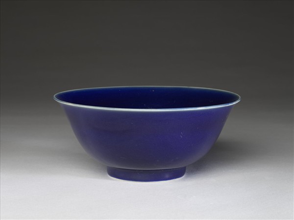 侈口窄唇,深壁,矮圈足。全器施霽青釉,施釉至足邊,口沿與足邊各留一道白邊,足緣無釉露白胎。足內壁及底施白釉,底有「大明宣德年製」六字二行楷款,外加雙圈。