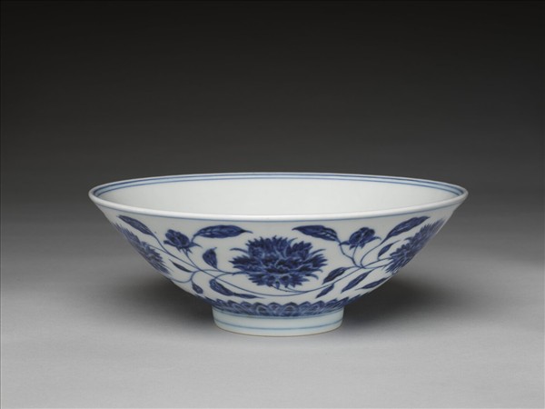 侈口,淺壁,矮圈足。外壁畫纏枝番蓮花六朵,底邊畫蓮瓣紋一周,口足間加飾青線六道。碗內底心畫葵花一朵,邊加雙線,周壁純白無紋飾。底有青花書「大明宣德年製」二行六字楷款,外加雙圈。