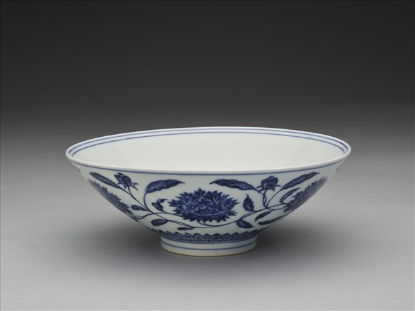 侈口,淺壁,矮圈足。外壁畫纏枝番蓮花六朵,底邊畫蓮瓣紋一周,口足間加飾青線六道。碗內底心畫葵花一朵,邊加雙線,周壁純白無紋飾。底有青花書「大明宣德年製」二行六字楷款,外加雙圈。