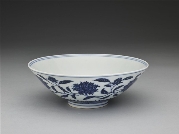 侈口,淺壁,矮圈足。外壁畫纏枝番蓮花六朵,底邊畫蓮瓣紋一周,口足間加飾青線六道。碗內底心畫葵花一朵,邊加雙線,周壁純白無紋飾。底有青花書「大明宣德年製」二行六字楷款,外加雙圈。