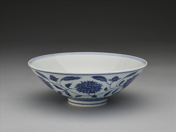 侈口,淺壁,矮圈足。外壁畫纏枝番蓮花六朵,底邊畫蓮瓣紋一週,口足間加飾青線六道。碗內底心畫葵花一朵,邊加雙線,週壁純白無紋飾。底有青花書「大明宣德年製」二行六字楷款,外加雙圈。