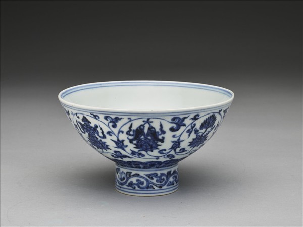 侈口窄唇,深弧壁,高圈足。外壁畫纏枝番蓮花,加飾八寶,底邊畫蓮瓣紋一周,足上畫尖角如意雲紋一道,口足間加飾青線九道。內面純白無紋飾。碗心有「大明宣德年製」青花楷書雙方框款,外加雙圈。
