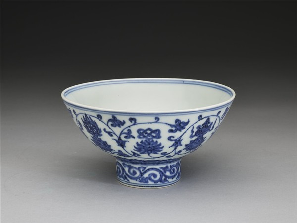 侈口窄唇,深弧壁,高圈足。外壁畫纏枝番蓮花,加飾八寶,底邊畫蓮瓣紋一周,足上畫尖角如意雲紋一道,口足間加飾青線九道。內面純白無紋飾。碗心有「大明宣德年製」青花楷書雙方框款,外加雙圈。