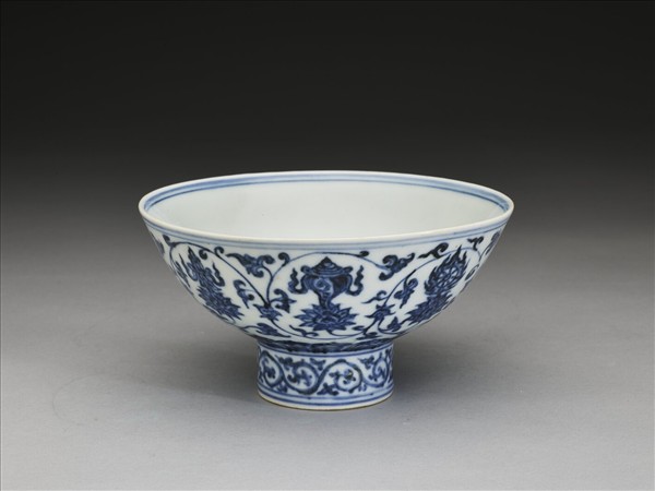 侈口窄唇,深弧壁,高圈足。外壁畫纏枝番蓮花,加飾八寶,底邊畫蓮瓣紋一周,足上畫尖角如意雲紋一道,口足間加飾青線九道。內面純白無紋飾。碗心有「大明宣德年製」青花楷書雙方框款,外加雙圈。